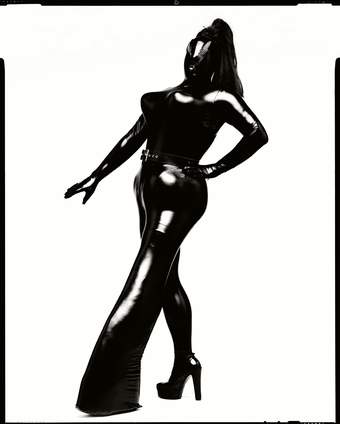 As Bowery entered the 1990s, he moved away from adding sequinned embellishments to his outfits. Continuing to create his designs in his home-studio, Bowery worked with Mr Pearl and new assistant Lee Benjamin to produce Looks that used foam, stretch fabric and latex to distort his body into a surreal, and at times alien-like, creature. Increasingly he considered his creations to be stand-alone artworks, and he was photographed and filmed by artists in studios and on the street to create performances solely for the camera. Bowery’s live performances became more shocking and extreme, influenced by the alternative drag and queer scenes in New York – at clubs like Jackie 60 and The Pyramid Club – and avant-garde performance artists.
