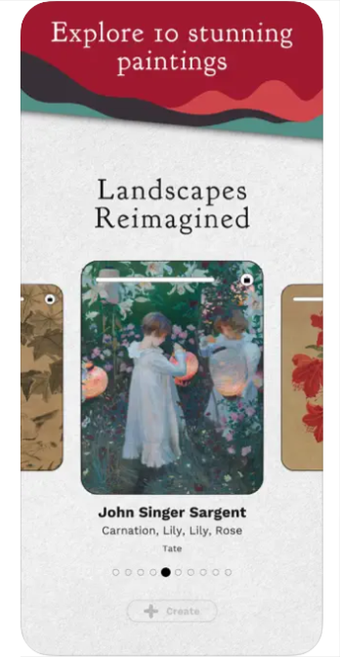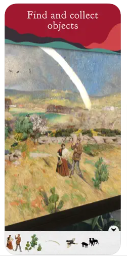The user is able to choose from 12 paintings. After selecting one, they can view the original work as a virtual gallery and interact with the painting - offering a multi sensory, digital experience. For example, tapping the phone screen activates animation and blowing creates movement or changes in weather. When a user interacts with the painting, they collect items and filters to use while creating their own artworks. Users can also photograph or video their creation and share on social media.